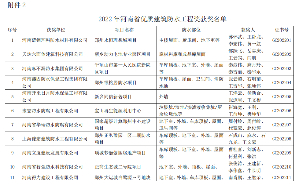 經河南省建筑防水協會專家評審,于2022 年 3 月 8 日又獲得2021 年度河南省建筑防水行業科技進步獎和河南省優質建筑防水工程獎(大豫杯)的稱號。